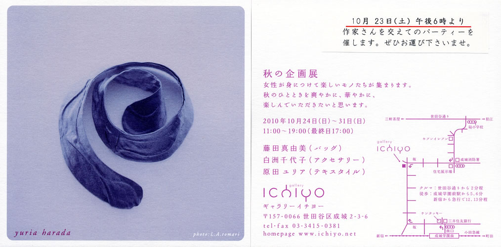 | 企画 | 「クリスマスフェアー 白洲千代子(accessory)/大槻智子(ceramic)/二宮とみ(print stoll)」 Yuria Art Textile Azabu 麻布台/東京 (12/10-18) | |