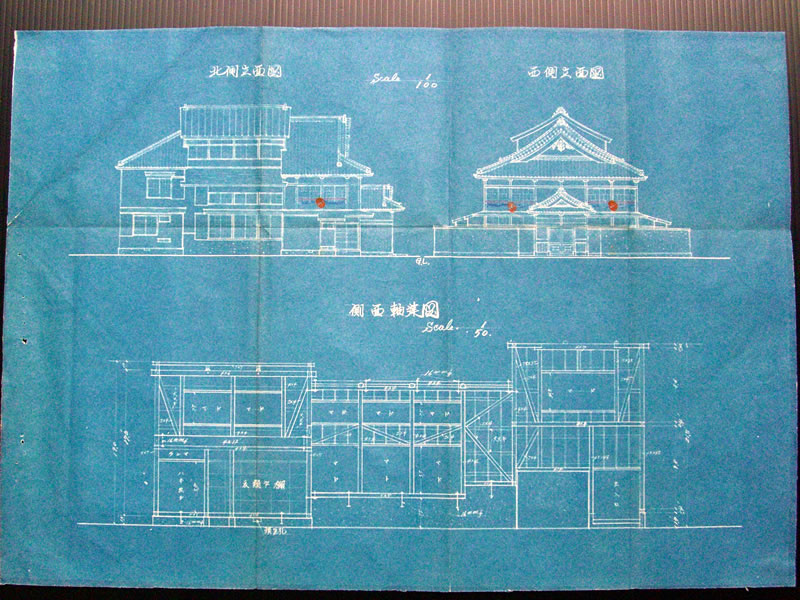 (流し場) 昭和32年「一の湯」建築時の青焼き図面他銭湯資料。富士山のペンキ絵も健在です。